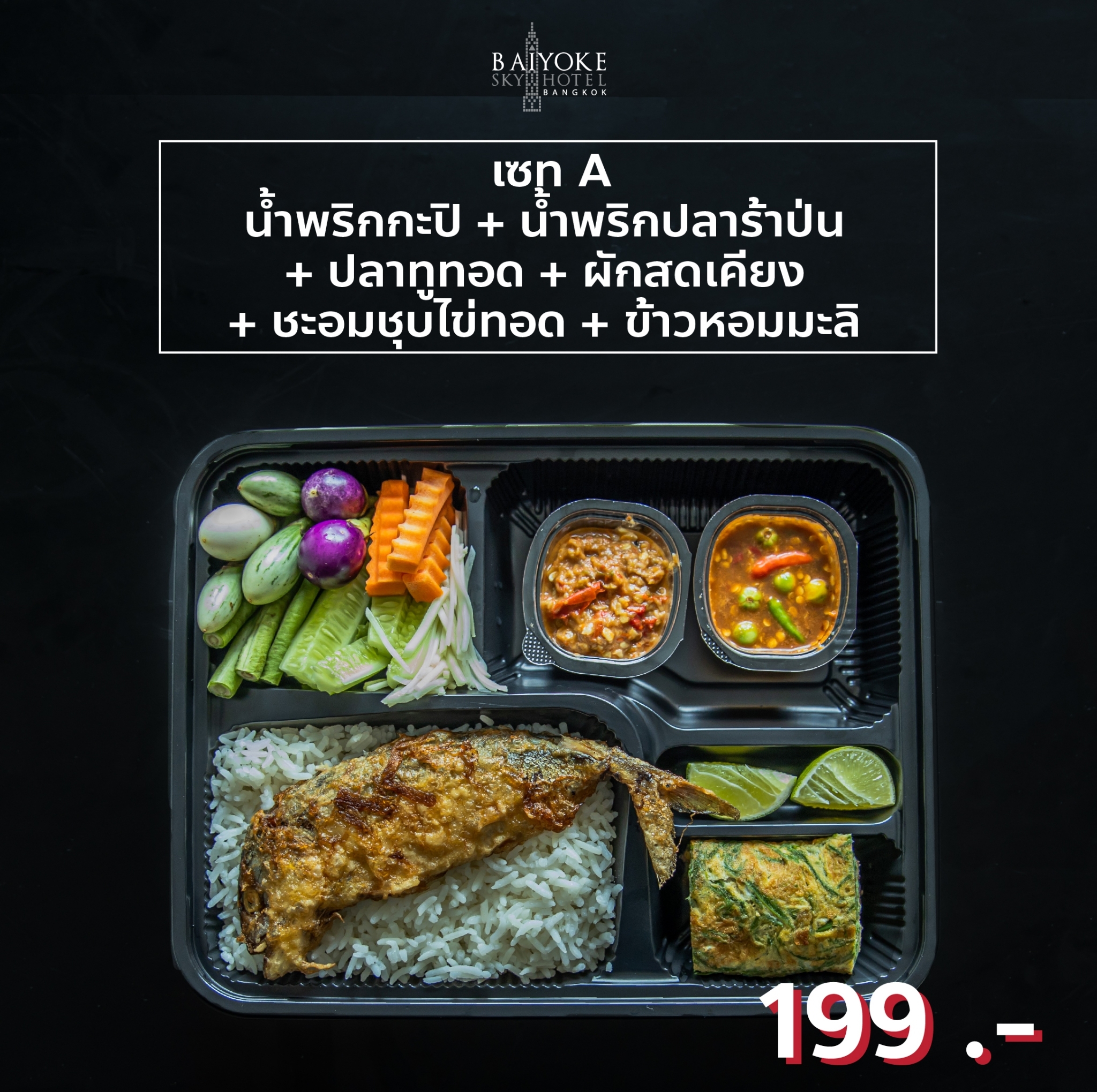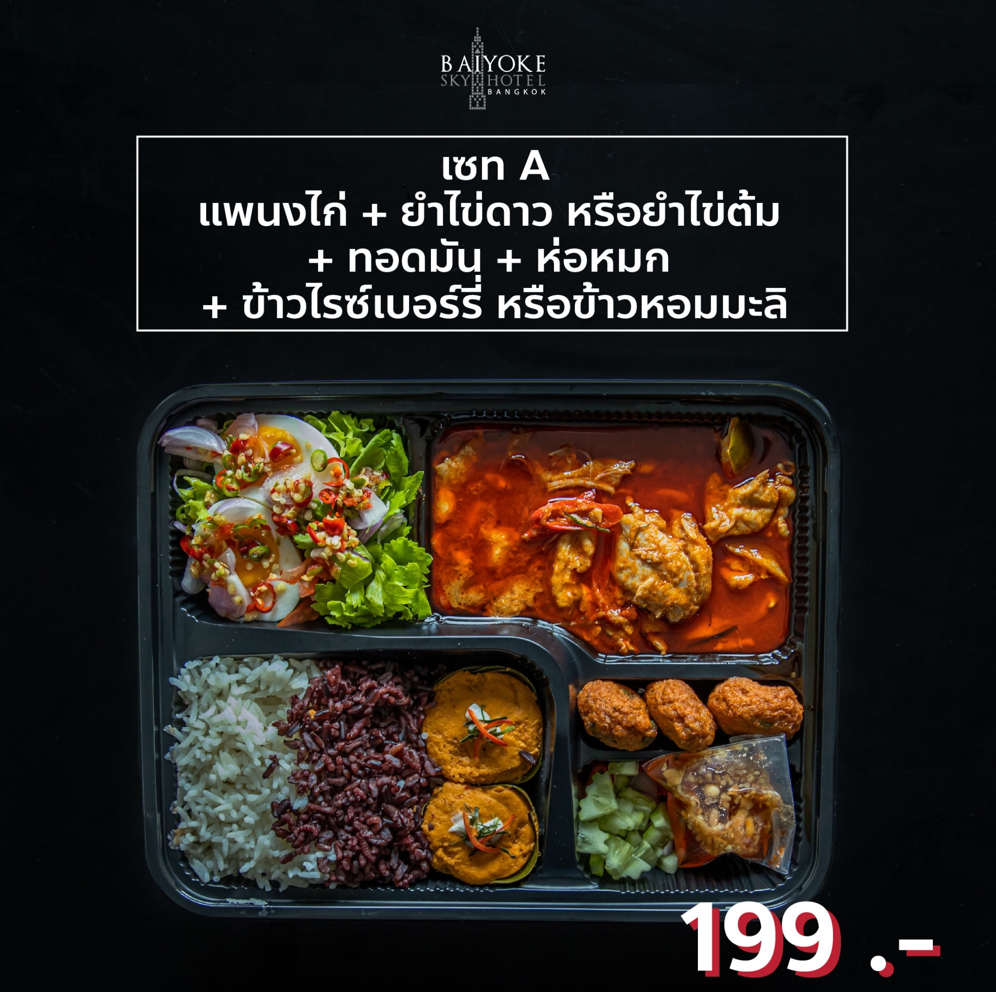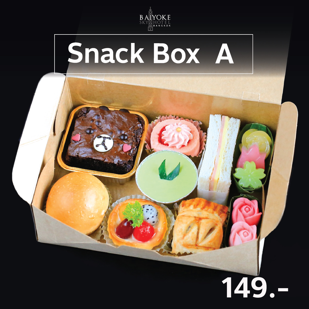 SET A บราวนี่, ขนมปังไส้ไก่, แยมโรลสตรอว์เบอร์รี่, เค้กสังขยาหน้านิ่ม, ทาร์ตผลไม้, แซนวิชแฮมชีส, พายซอสเซสโรล, ขนมชั้น, วุ้นดอกไม้ 149.-