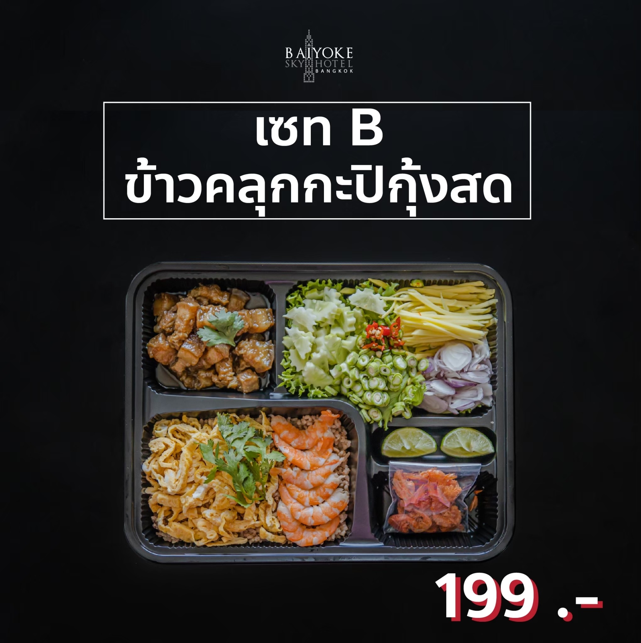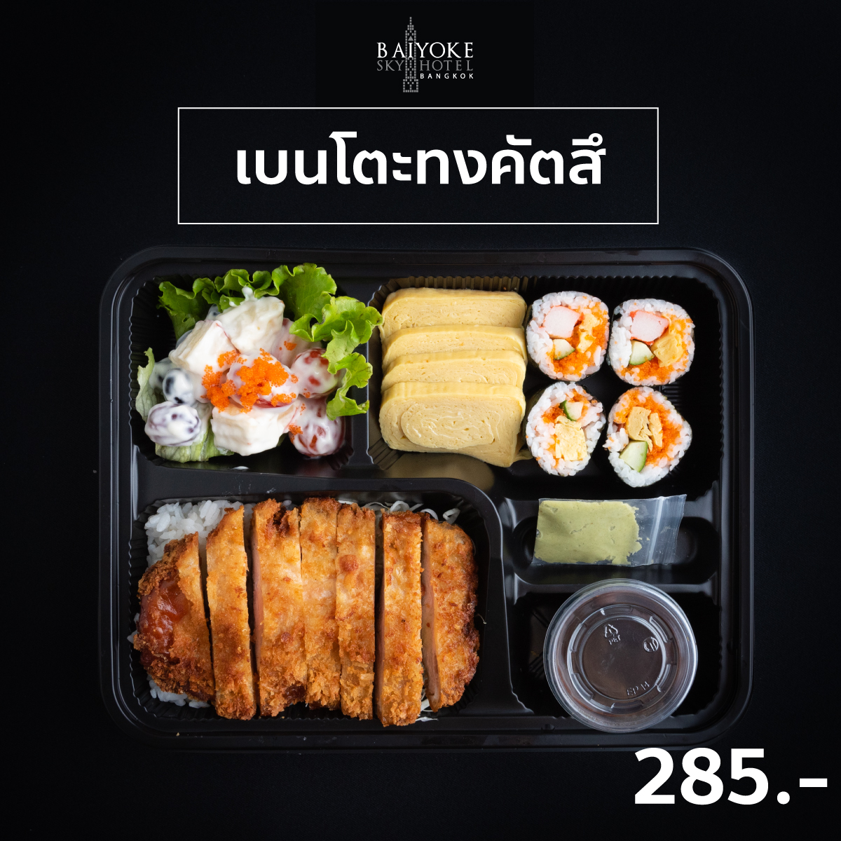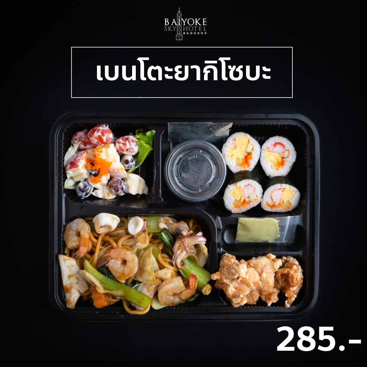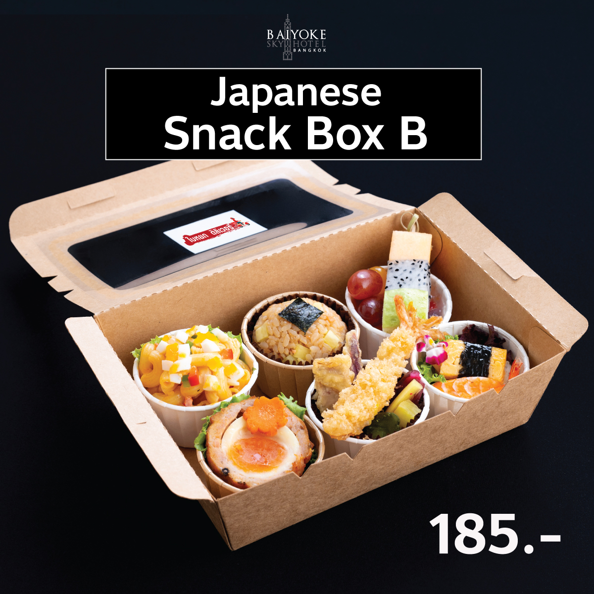 Japanese Snack Box 185 บาท SET B สลัดมักกะโรนีไข่สับ ข้าวปั้นแซลมอนตะก้วง วุ้นผลไม้+ผลไม้สด มีทบอลหมู+ไข่ เทมปุระรวม+ผักดอง เอบิ+ทามาโกะชูชิ