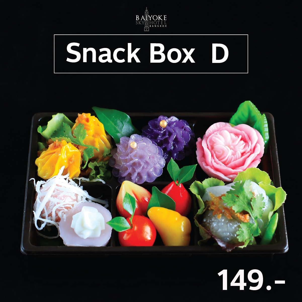 SET D ขนมจีบ, ขนมต้ม, บุหลัน, ผกากรอง, ลูกชุบ, วุ้นดอกไม้, สาคูไส้หมู, ปากหม้อไส้หมู 149.-