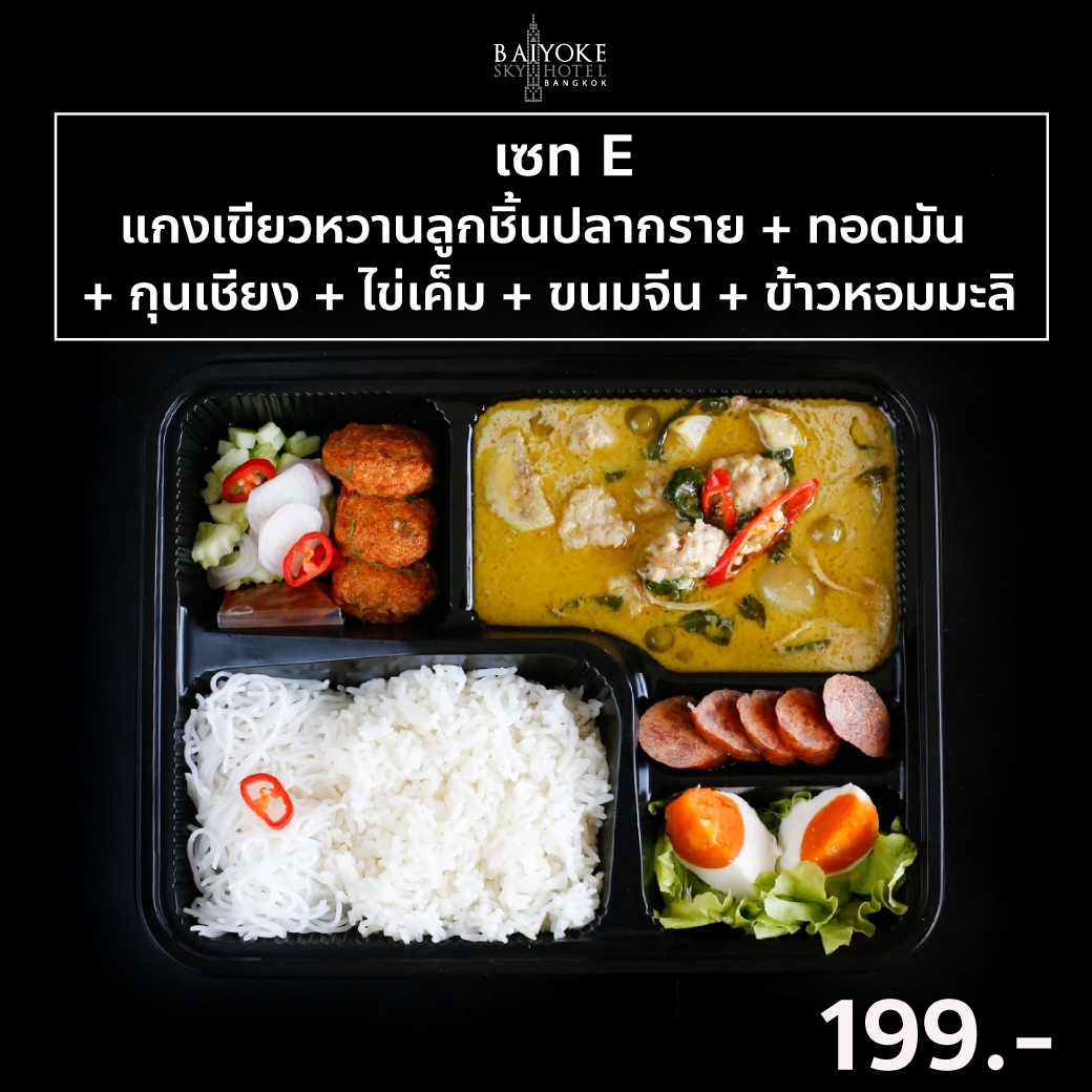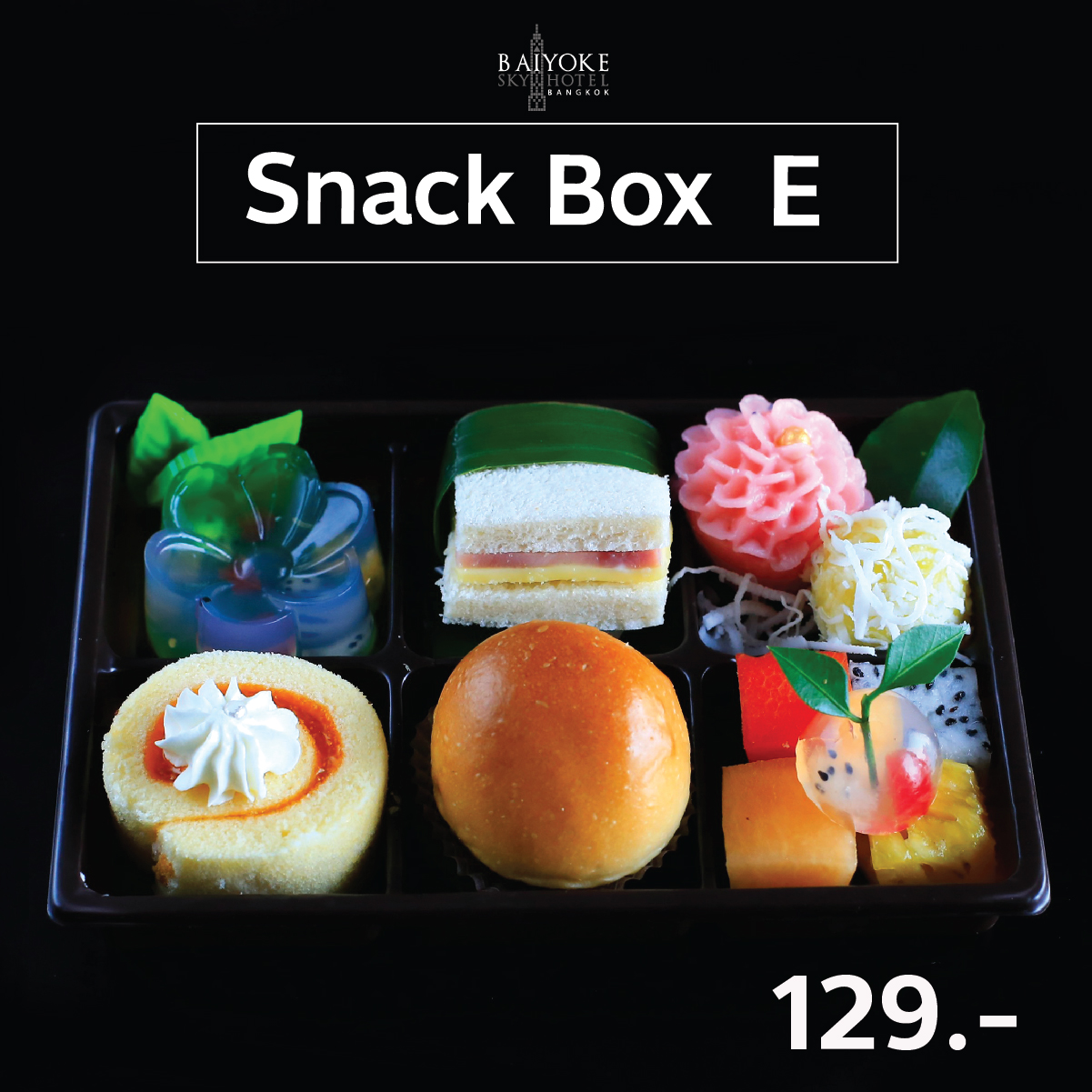 SET E วุ้นดอกไม้, แยมโรลส้ม, แซนวิชแฮมชีส, ขนมปังไส้ไก่, ผกากรอง, ขนมต้ม, ผลไม้รวม 129.-