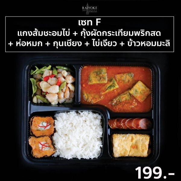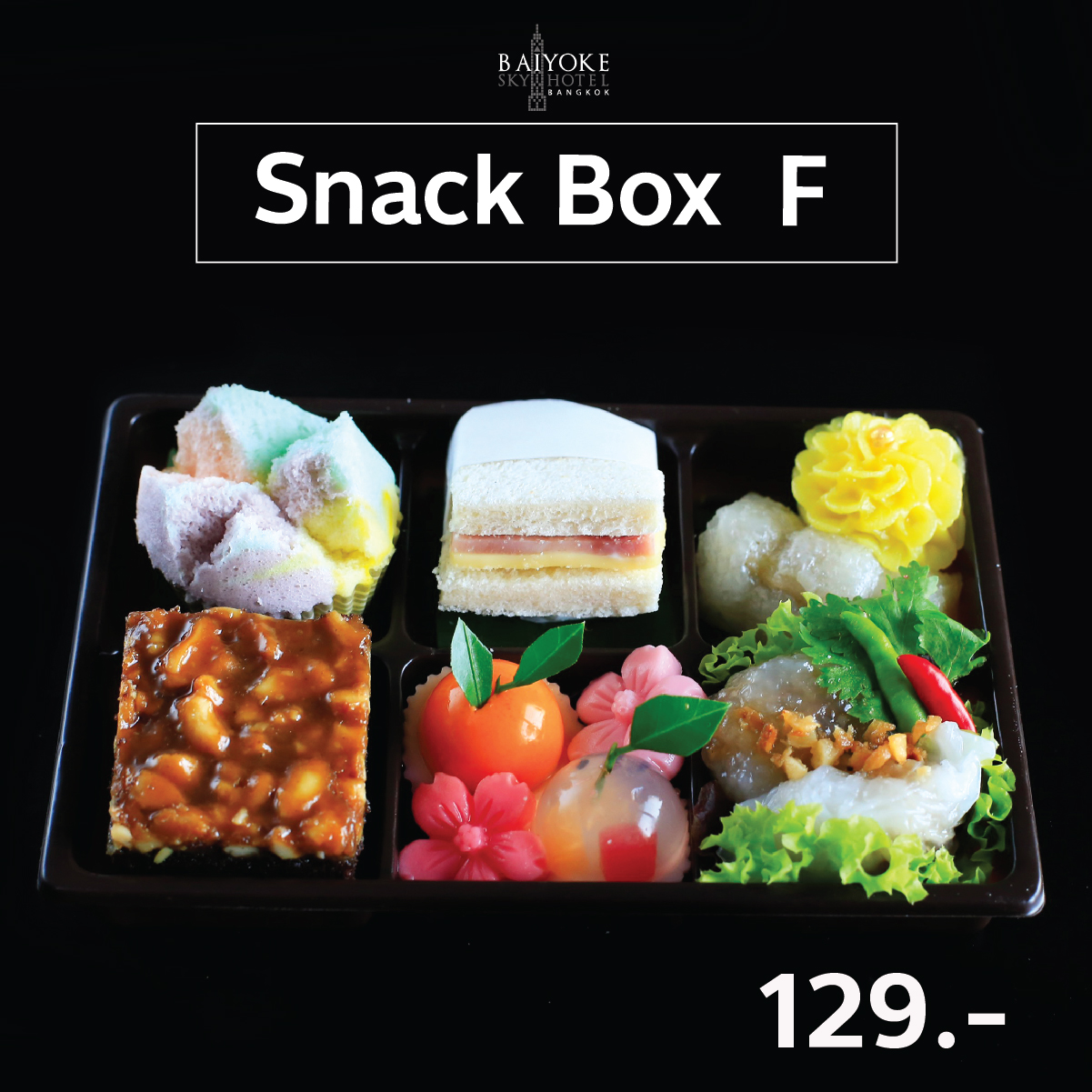 SET F ปุยฝ้าย, ทอฟฟี่เค้ก, แซนวิชแฮมชีส, วุ้นกะทิลูกส้ม, วุ้นกะทิผลไม้, วุ้นซากุระ, ผกากรอง, ข้าวต้มมัด, สาคูไส้หมู, ปากหม้อไส้หมู 129.-