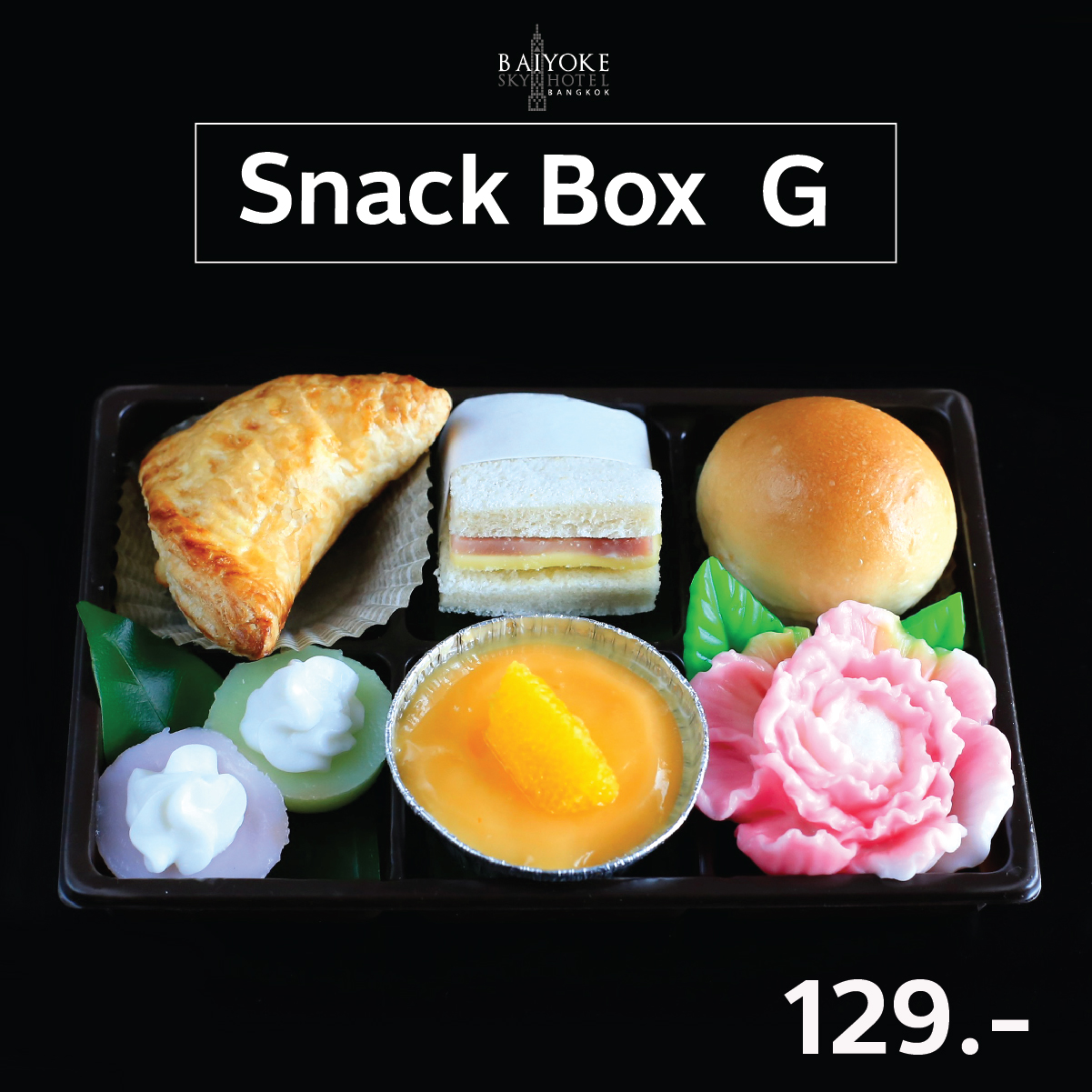 SET G พายไก่, บุหลัน, แซนวิชแฮมชีส, เค้กส้มหน้านิ่ม, ขนมปังหมูหยอง, วุ้นกะทิดอกไม้ 129.-
