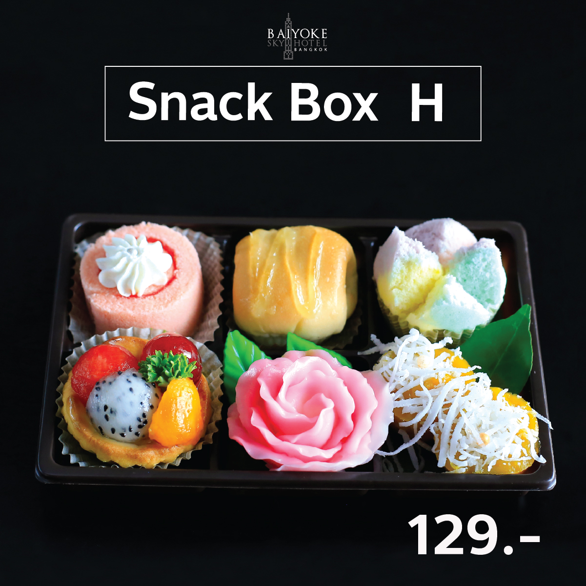 SET H แยมโรลสตรอว์เบอร์รี่, ทาร์ตผลไม้, ขนมปังไส้กรอกไก่, วุ้นดอกไม้, ปุยฝ้าย, ขนมฟักทอง 129.-